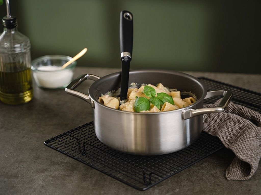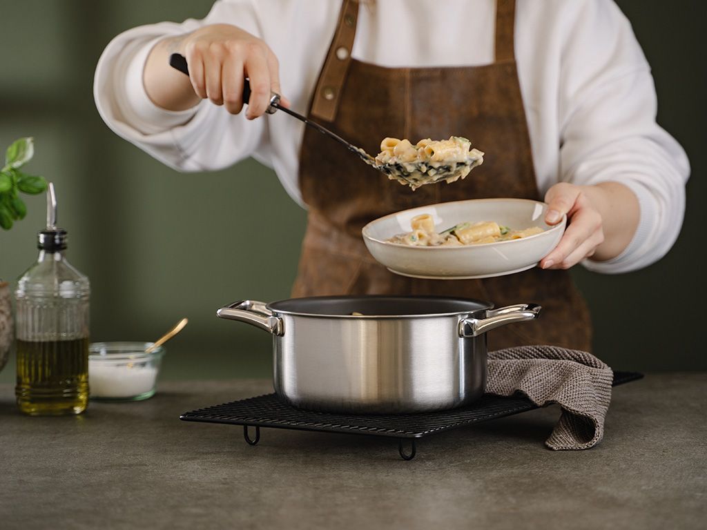 Il n'est pas nécessaire de passer à des outils spéciaux en silicone ou en bois. Vous pouvez cuisiner comme vous le faites habituellement, avec les outils que vous avez déjà. La surface est résistante à l'usure et est conçue pour un usage quotidien répété, même avec un contact direct avec le métal.